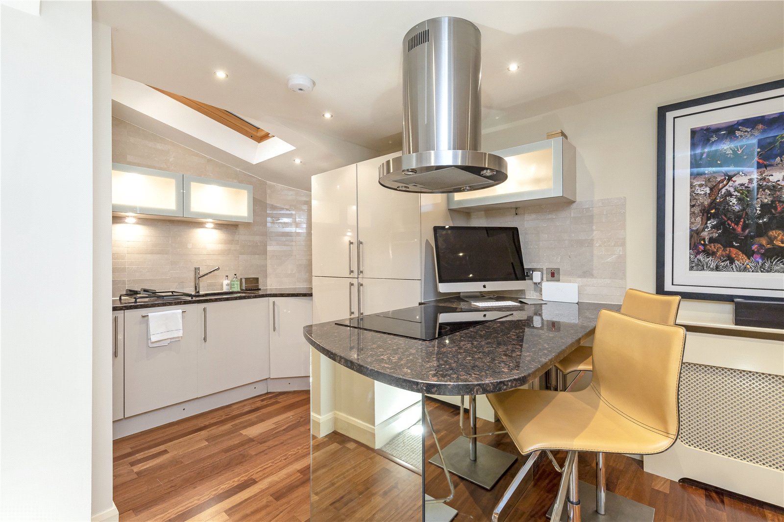 The kitchen is finished to a high modern specification with sleek cabinetry and integrated appliances. A central breakfast bar with seating provides an informal dining area and an ideal space for entertaining, while a skylight above allows natural light to flood the room. The adjacent utility room offers additional storage and practicality.