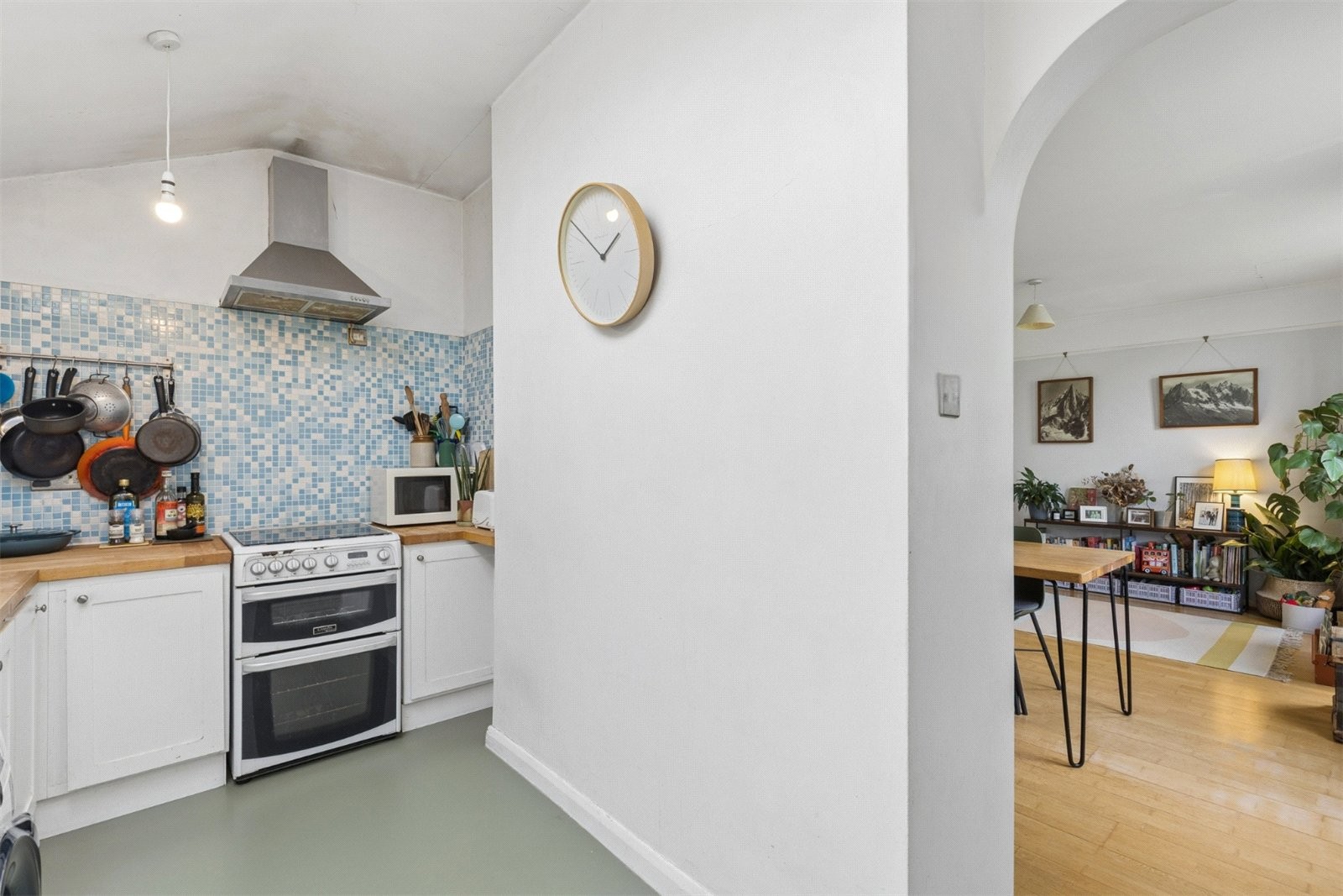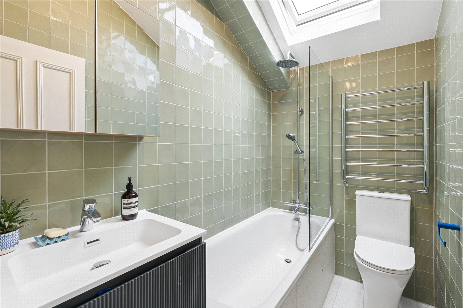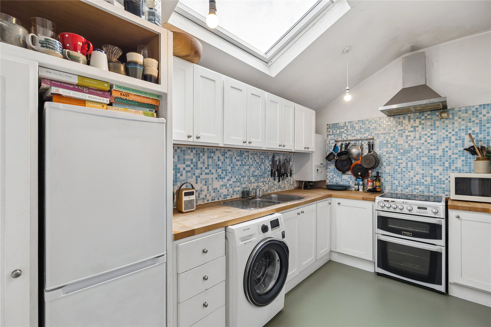 The generous reception room is a standout feature, with large newly installed double glazed sash windows framing leafy views and allowing natural light to flood the space, ideal for both relaxing and entertaining. The adjoining kitchen is well laid out with ample storage, worktop space and a charming skylight above, creating a light and airy environment.